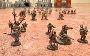 Der Söldnerführer Garth Nevar (Company Commander, Mitte vorne), genannt der Mann mit der Goldenen Hand, links der Salzkrieger Sindar (Platoon Commander mit Energieschwert). Zwei Command Squads im Vordergrund